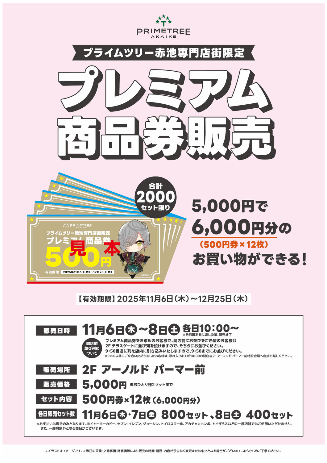 11月6日(木)~8日(土)の3日間限定でプライムツリー赤池専門店街でご利用いただける「プライムツリー赤池専門店街プレミアム商品券」の販売を行います。