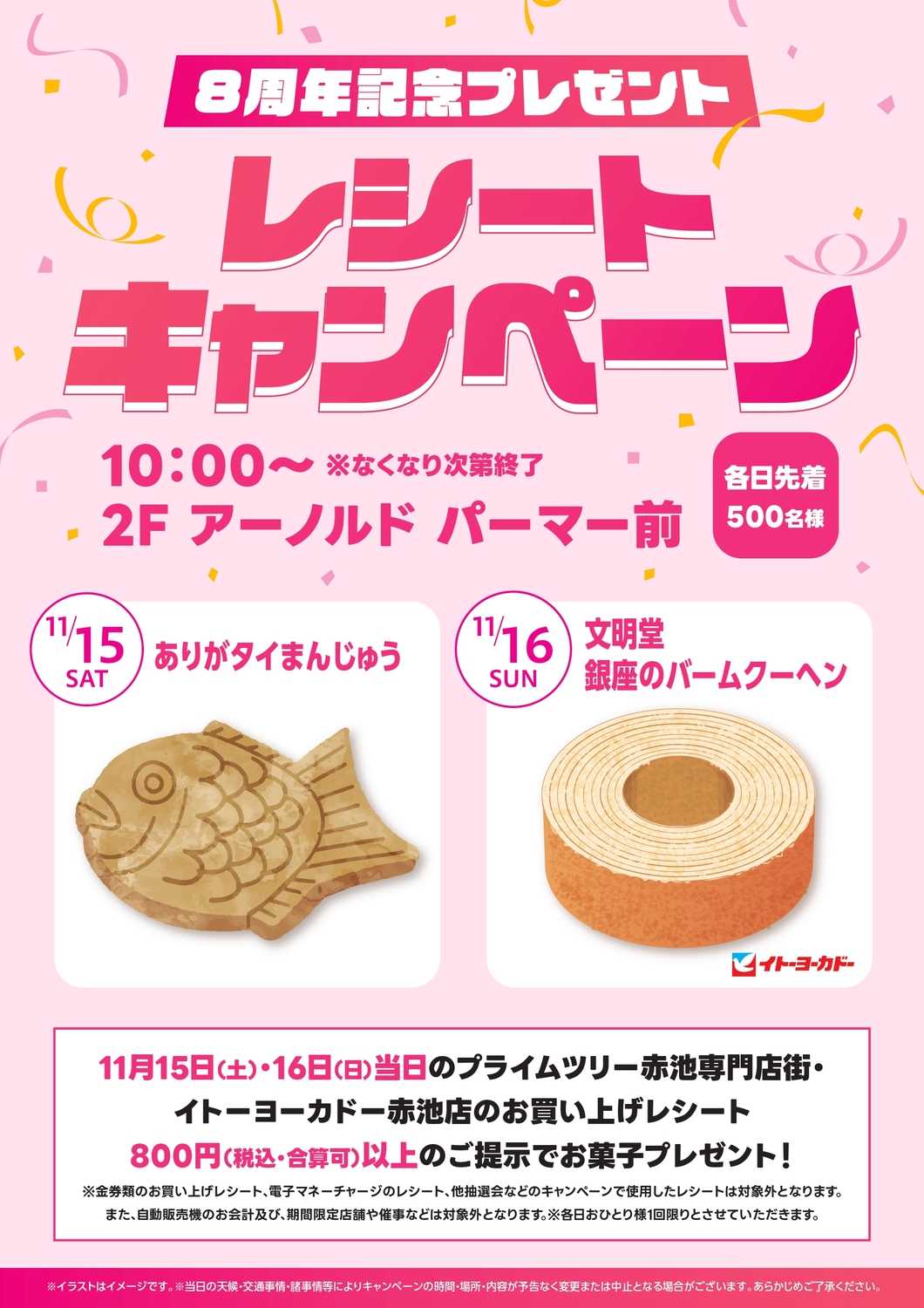 プライムツリー赤池専門店街・イトーヨーカドー赤池店での当日のお買い上げレシート800円(税込・合算可)以上のご提示でお菓子を各日先着500名様にプレゼント!