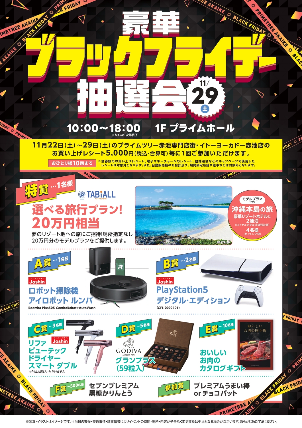対象期間のプライムツリー赤池専門店街・イトーヨーカドー赤池店でのお買い上げレシート5,000円(税込・合算可)ごとに1回、おひとり様10回までご参加いただけます。