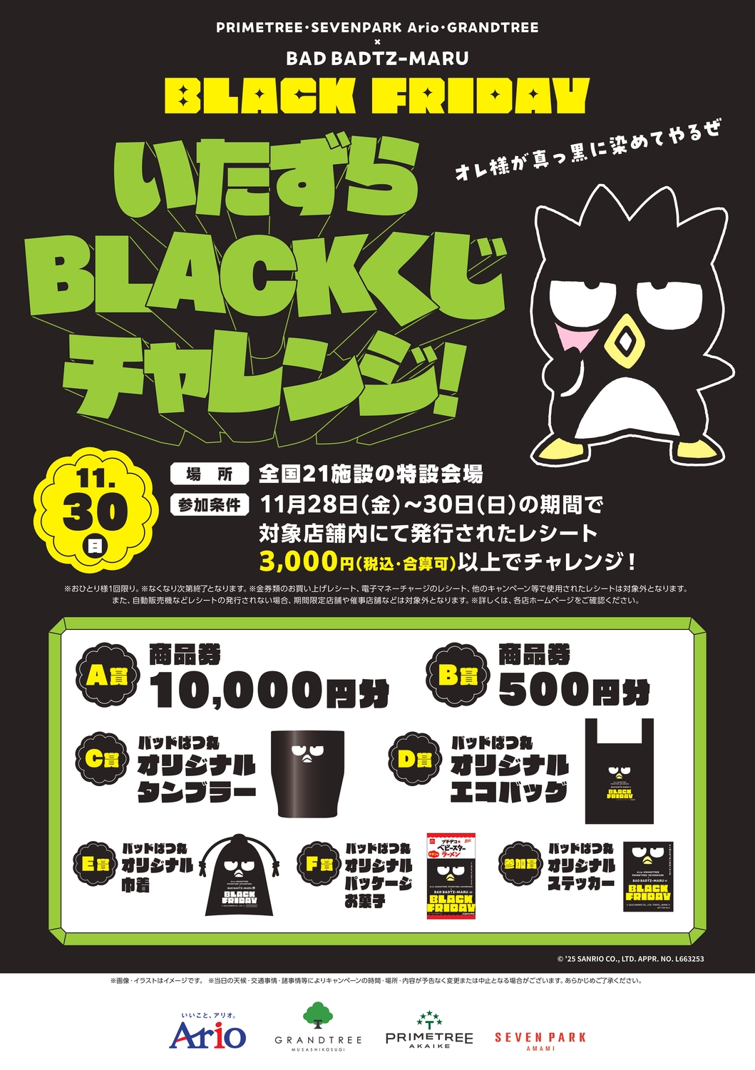 期間中、プライムツリー赤池専門店街でのお買い上げレシートを提示すると、「いたずらBLACKくじチャレンジ!」に参加できます。