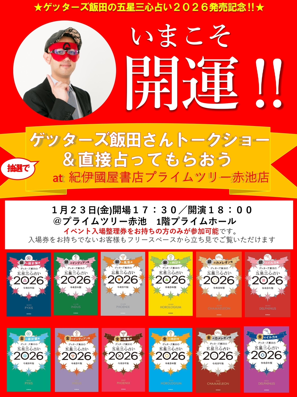 紀伊國屋書店プライムツリー赤池店にて販売しております『ゲッターズ飯田の五星三心占い2026(朝日新聞出版刊行物12点対象)』をご購入および抽選くじを引き当選された方(「イベント参加整理券」をお持ちの方)のみご入場いただけます。
