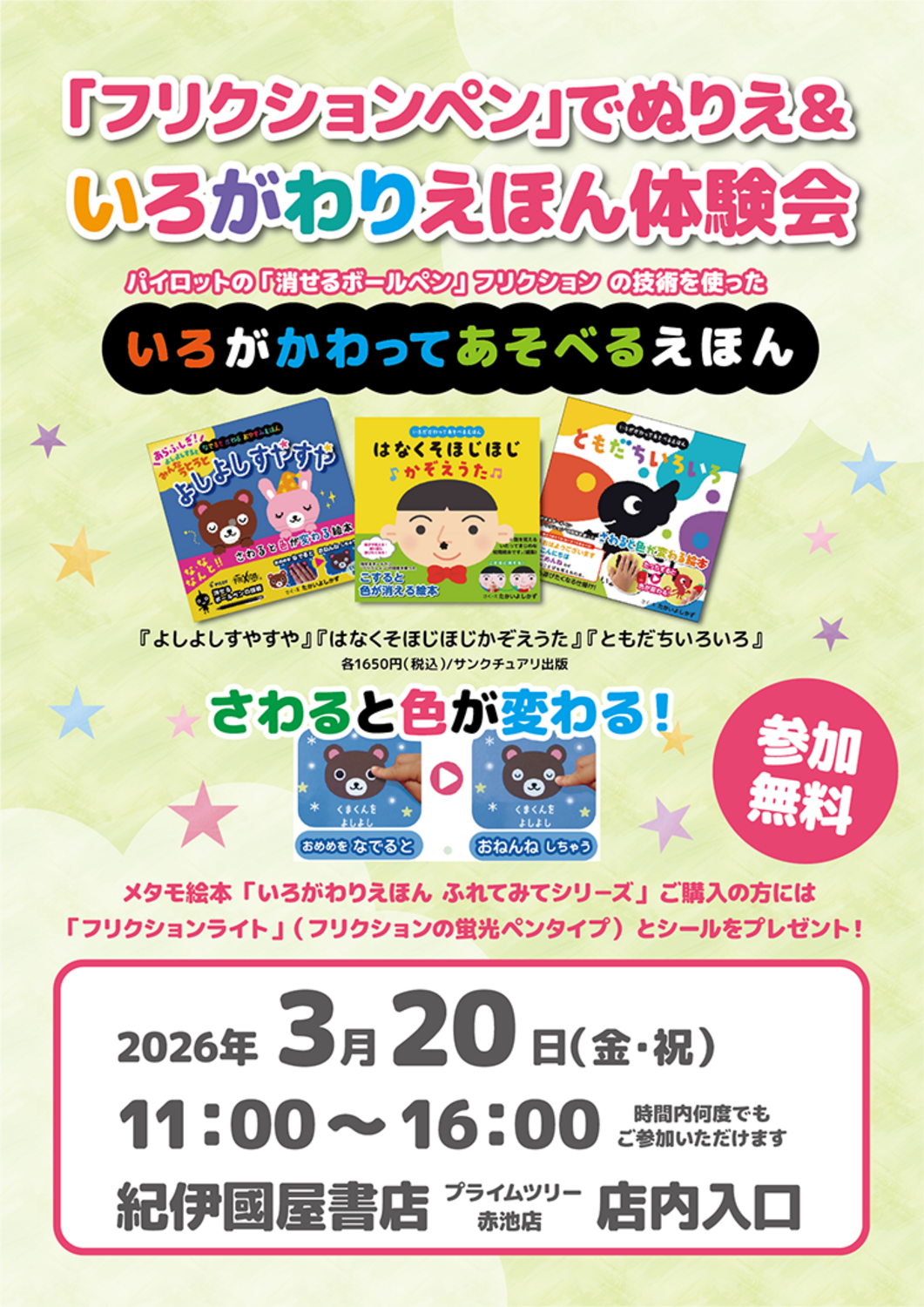 ※当日メタモ絵本「いろがわりえほん ふれてみてシリーズ」ご購入の方には「フリクションライト」(フリクションの蛍光ペンタイプ)とシールをプレゼント!