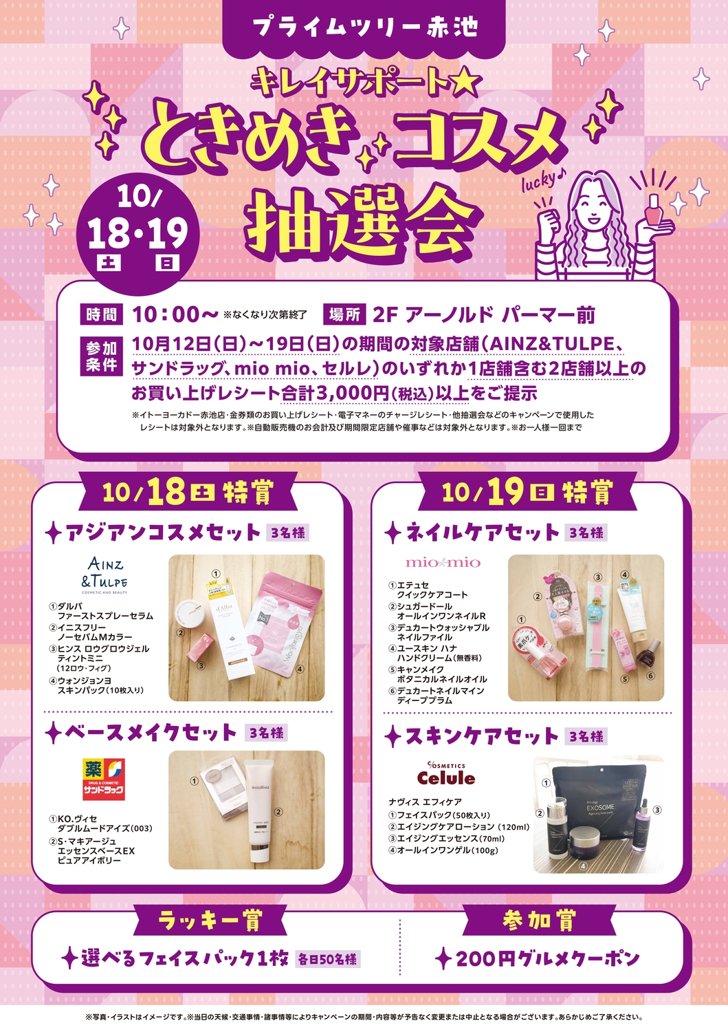 2025年10月12日(土)~19日(日)の期間、プライムツリー赤池専門店街『AINZ&TULPE、サンドラック、mio mio、セルレ』のいずれか1店舗を含む2店舗以上のお買い上げレシート合計3,000円(税込)以上をご提示で、お一人様一回までご参加いただけます。
