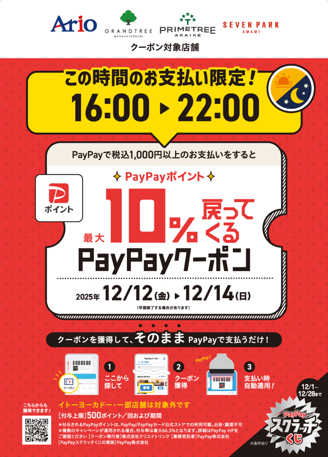 対象店舗にて16:00~22:00の時間にPayPayでお支払いすると最大10%PayPayポイントが戻ってくる!