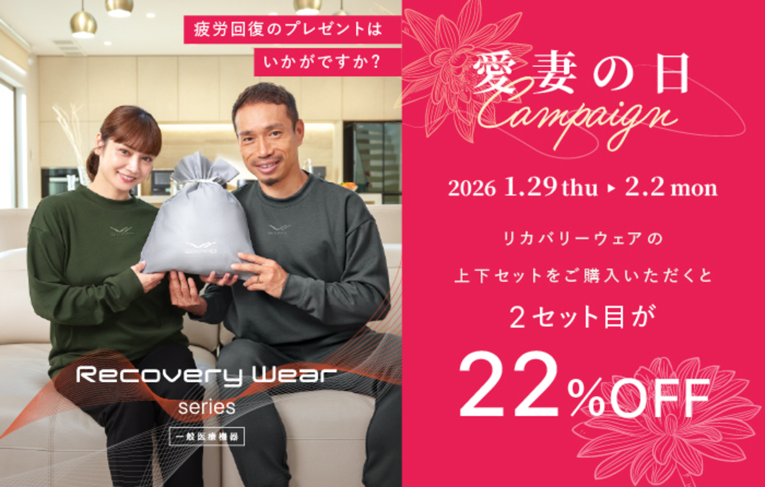 リカバリーウェアの上下セットを2セットご購入いただくと、